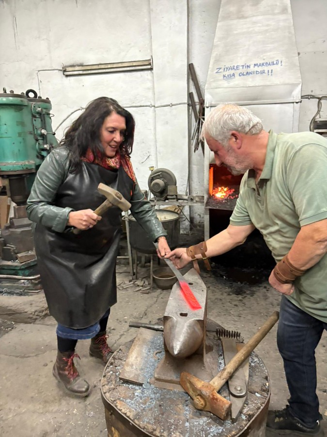 Bettany Hughes atölyede Yusuf Usta ile karşılıklı demir dövdü.