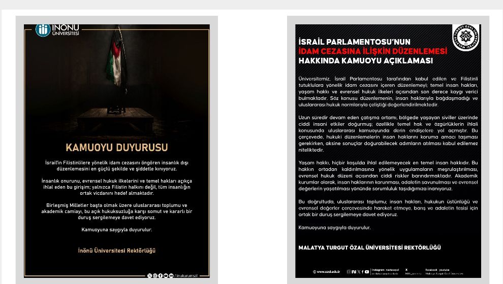 Malatya – Malatya’da bulunan İnönü Üniversitesi ve Malatya Turgut Özal Üniversitesi rektörlükleri, İsrail Parlamentosu tarafından Filistinli tutuklulara yönelik hazırlanan idam cezası düzenlemesine karşı ortak tepki gösterdi. Her iki üniversite tarafından yapılan kamuoyu açıklamalarında, söz konusu adımın evrensel hukuk ilkeleri ve temel insan haklarıyla çeliştiği vurgulandı. Akademik kurumlar, uluslararası toplumu bu duruma karşı somut bir duruş sergilemeye davet etti.