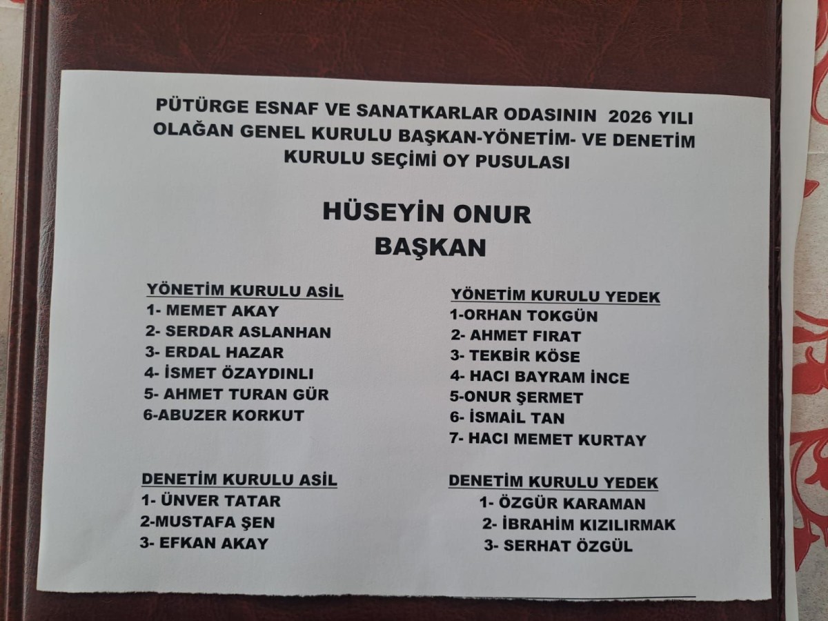 Pütürge Esnaf ve Sanatkarlar Odası, 2026 yılı Olağan Genel Kurulu’nu ilçe merkezinde gerçekleştirdi. Genel kurul süreci, Ticaret Bakanlığı gözetiminde ve İlçe Seçim Kurulu tarafından yürütüldü. Mevcut başkan Hüseyin Onur’un hazırladığı tek listenin oylandığı seçimlerde, esnaf ve sanatkarlar sandığa giderek yönetim tercihini yaptı.